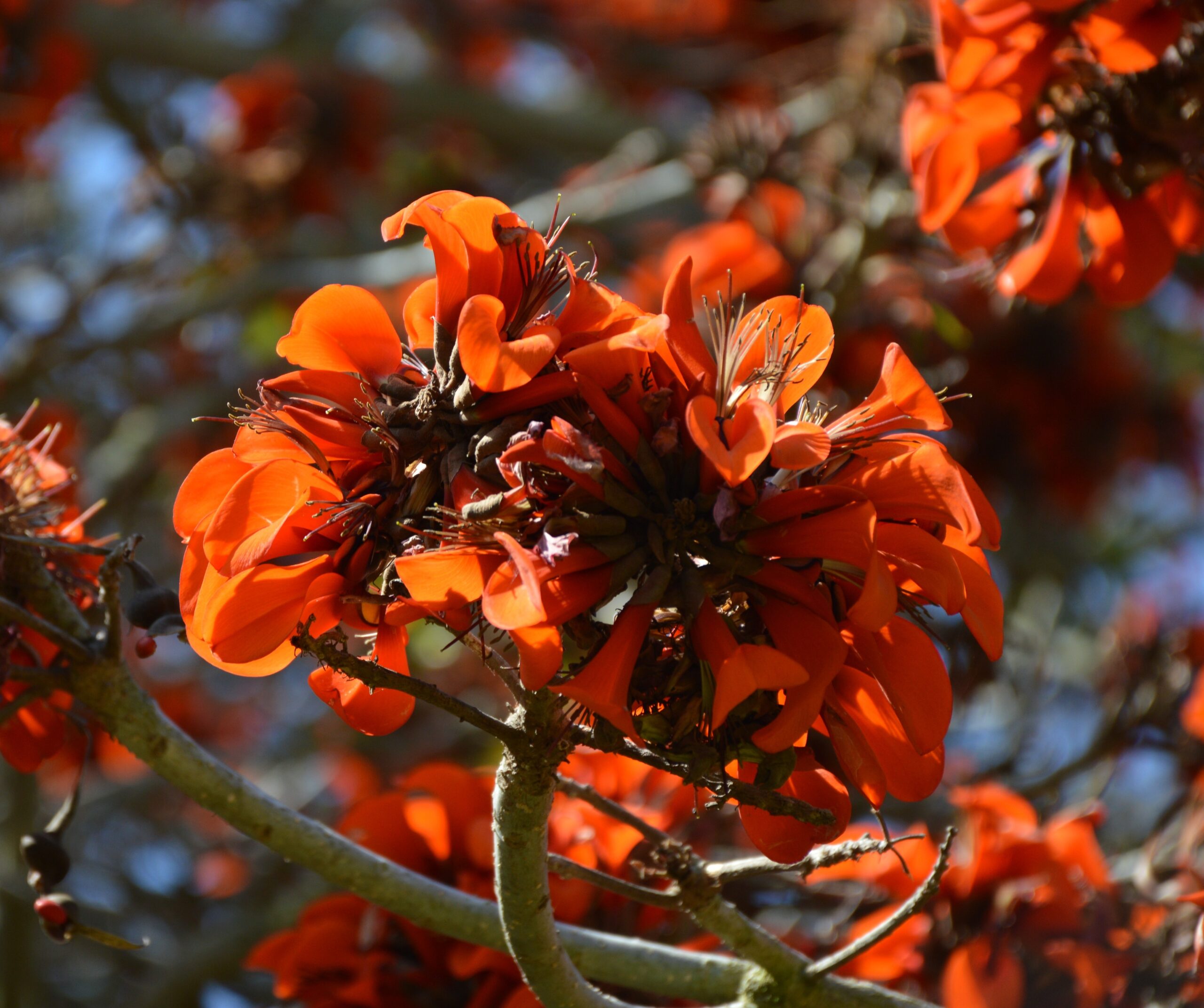 The African Coral Tree is one of the most spectacular of flowering trees. It is the largest of more than a dozen coral tree species that grow in our area and has the most magnificent floral display. Its large clusters of coral-colored flowers are remarkable standouts in the landscape, particularly as they appear on nearly bare branches during a short deciduous period.