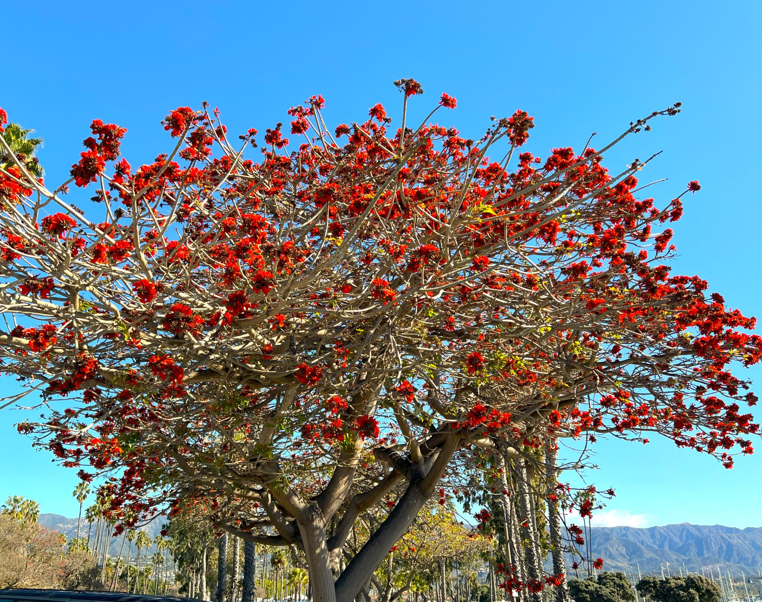 The African Coral Tree was introduced to Santa Barbara in 1908 by the pioneering horticulturist and nurseryman, Dr. Francesco Franceschi. Since then, it has been frequently planted in coastal areas throughout Southern California. Its popularity can be attributed to its relatively fast growth, gorgeous flowers, and dense canopy of leaves. Its beauty has garnered such admiration that it has been designated the official tree of Los Angeles.