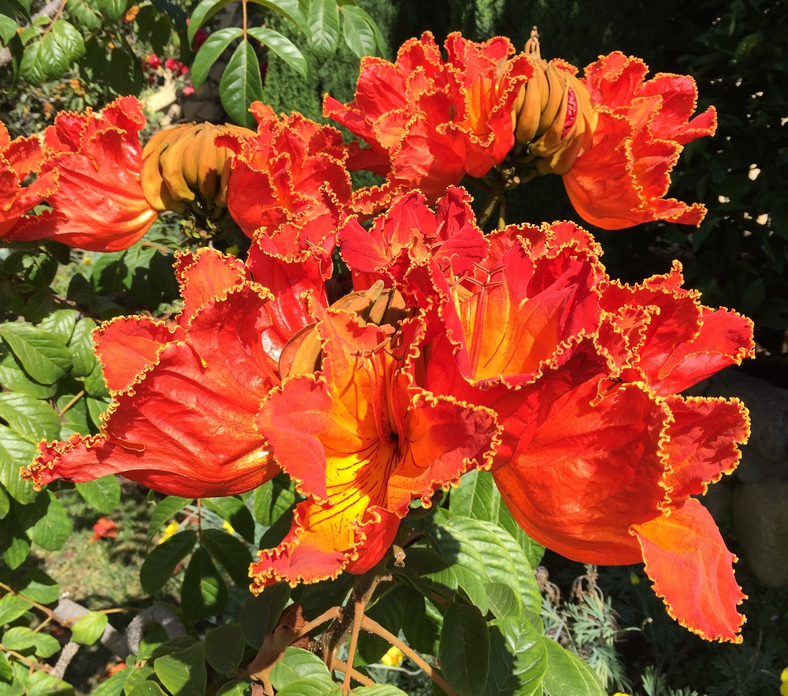 As its name implies, African Tulip Tree is native to Africa, from Senegal to Ethiopia, appearing in dry-tropical forests. They are reputed to be invasive in tropical regions – though not in our warmer Mediterranean climate.