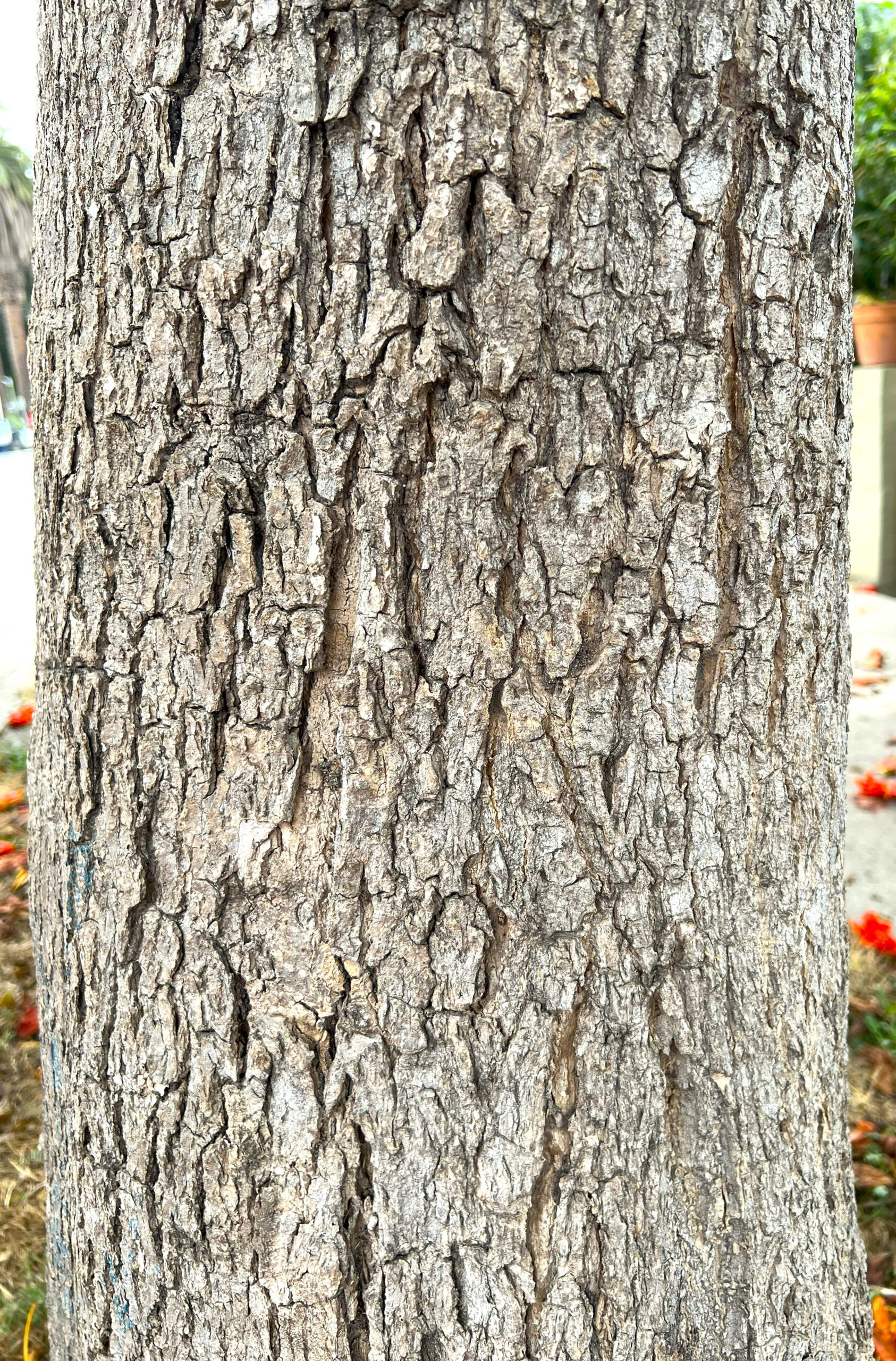 Other common names for African Tulip Tree are “Flame Tree”, “Pickari”, and “Nandi Flame Tree”. It is in the Bignoniaceae (trumpet flower) plant family – and, thus, is related to the Jacaranda tree (Jacaranda mimosifolia) that also flowers here so spectacularly. Its botanical name is Spathodea campanulata. The genus name, Spathodea, comes from a combination of the Greek words “spathe” (meaning “boat-shaped”) and “oides” (meaning “resembling”), referring to the shape of the flowers. The specific epithet, campanulata, comes from the Latin word, “campanula” (meaning “little bell”), also referring to the flower shape.