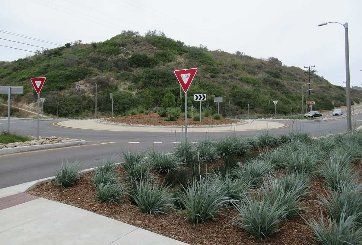 The newly installed Las Positas-Cliff Drive Roundabout is located at the confluence of three natural landmarks: Arroyo Burro Creek, Elings Park and the Douglas Family Preserve. It serves as a gateway to coastal access for thousands of Santa Barbara visitors and residents. First programmed as a street improvement project in 2002, work on this busy intersection accelerated in 2014 when the City contracted with Kittelson & Associates to complete the final design for the roundabout with David R. Black & Associates providing the landscape design in collaboration with the Santa Barbara Parks and Recreation Department staff.