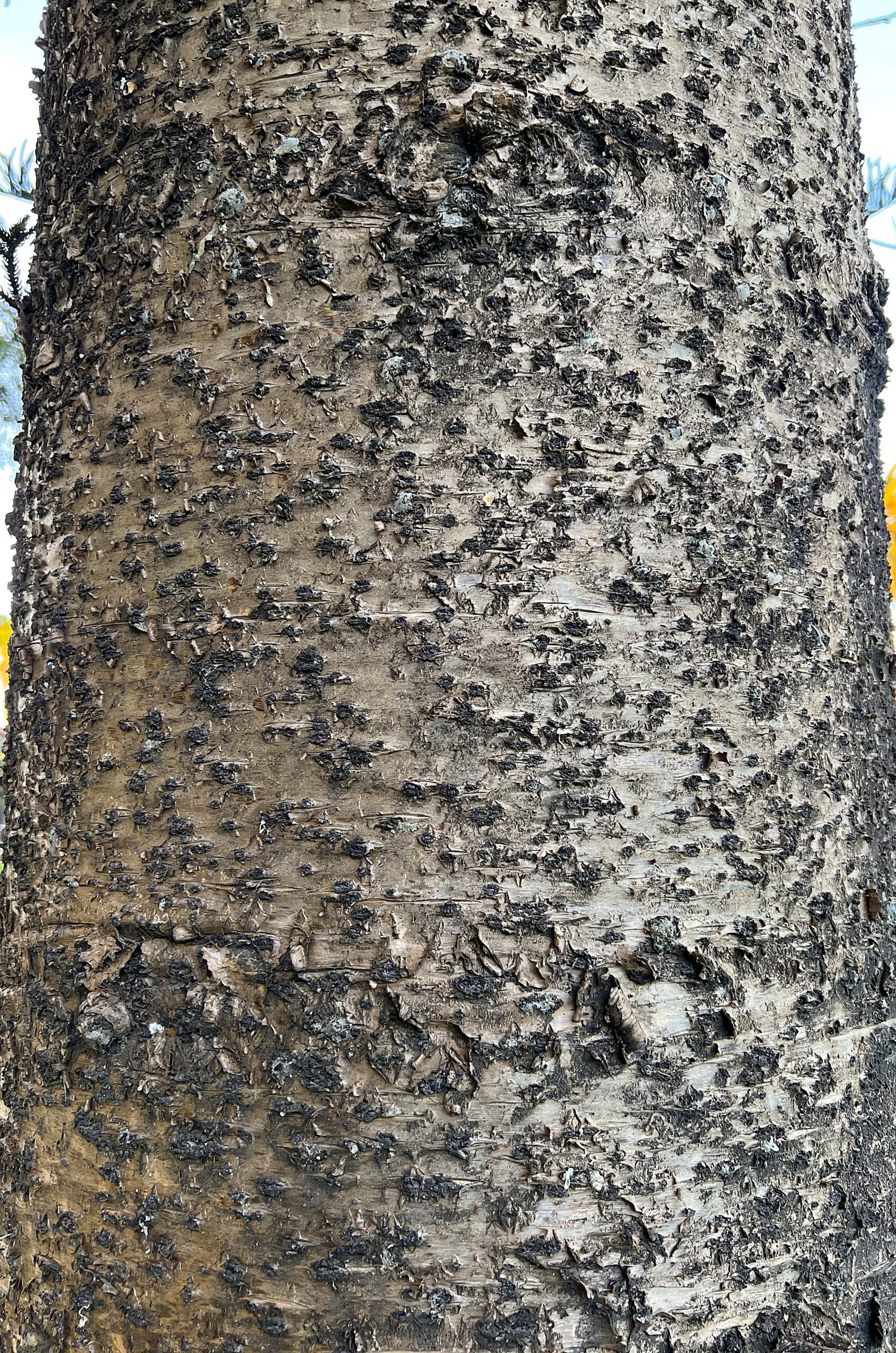 Norfolk Island Pine is notable for its symmetrical form, with whorls of horizontal branches widely spaced apart along an otherwise bare, straight, single trunk. Its dark brown to black bark is rough and peels off in thin layers.