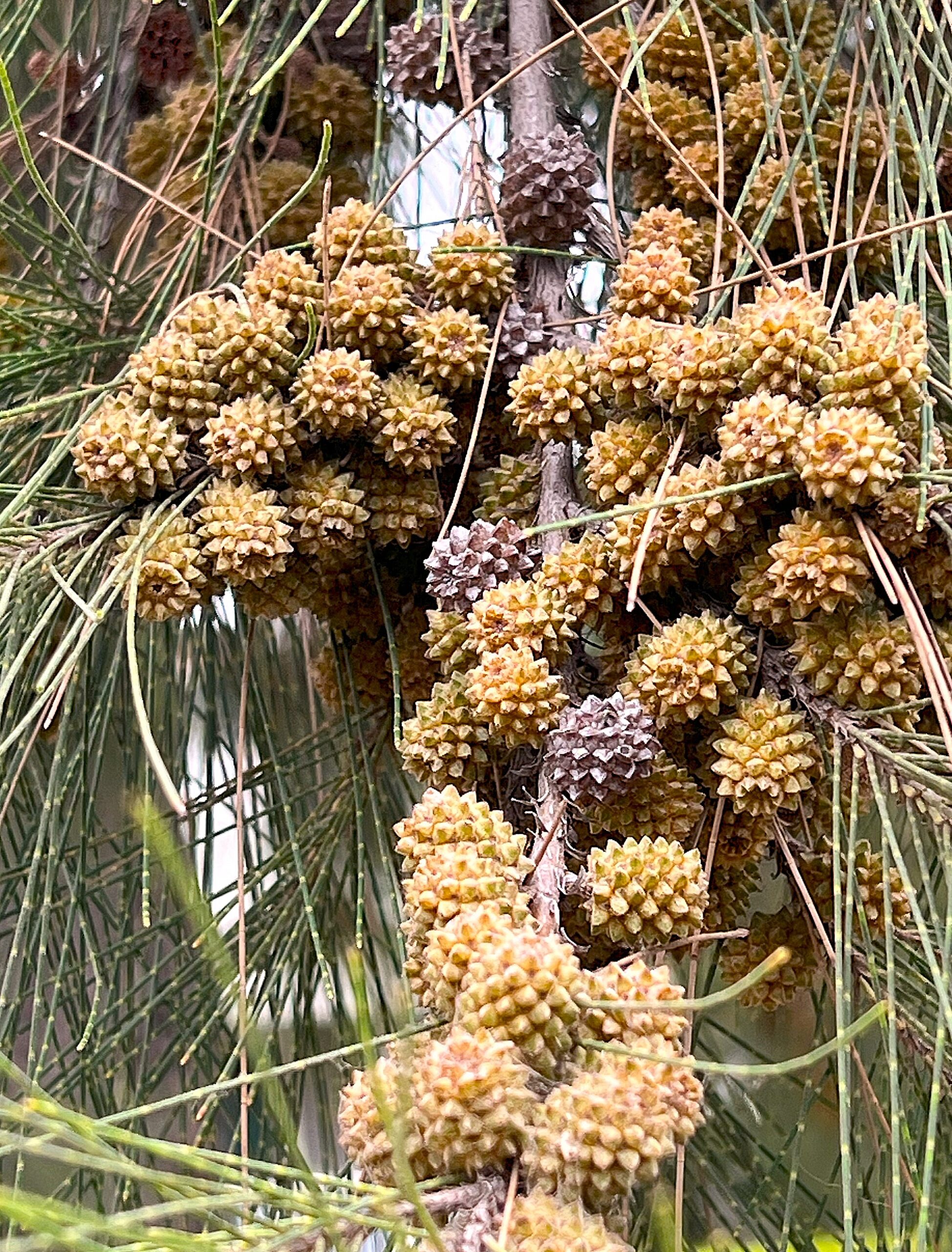 River She-Oak is an evergreen tree that can be considered a master (or a mistress?) of illusion. It has a pine-like appearance – but is not a pine at all. It isn’t even any type of conifer (a “gymnosperm”), which reproduces through seed cones and pollen cones. It is, in fact, a flowering plant (an “angiosperm”) – and one of the very earliest to have evolved eons ago.