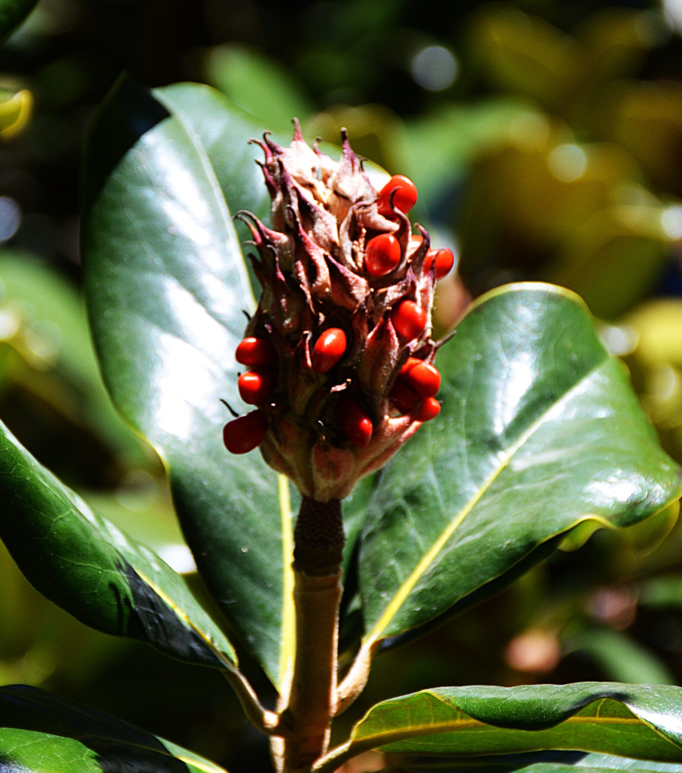 Pollinated flowers develop a long (3- to 5-inches) cone-like fruit, consisting of follicles covered with brown fuzzy hairs. When mature, each follicle will split open to reveal a shiny bright-red seed. The tasty seeds are eaten by hungry birds and other animals – and subsequently spread abroad with a dollop of fertilizer.