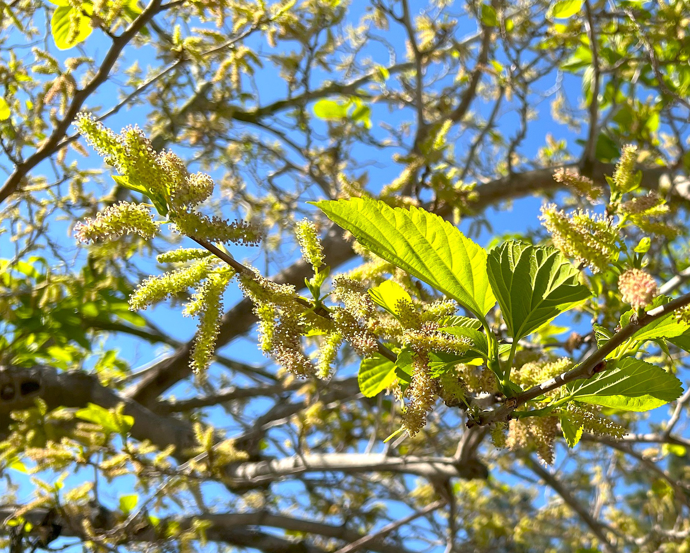 Fruiting mulberry trees are usually “dioecious”, which means male flowers and female flowers occur on separate trees – but some varieties are “monoecious”, which means both male flowers and female flowers occur on a single tree.  In either case, in March through May, yellow-green, inconspicuous, tiny flowers form on drooping spikes, called “catkins” (1- to 2-inches long).